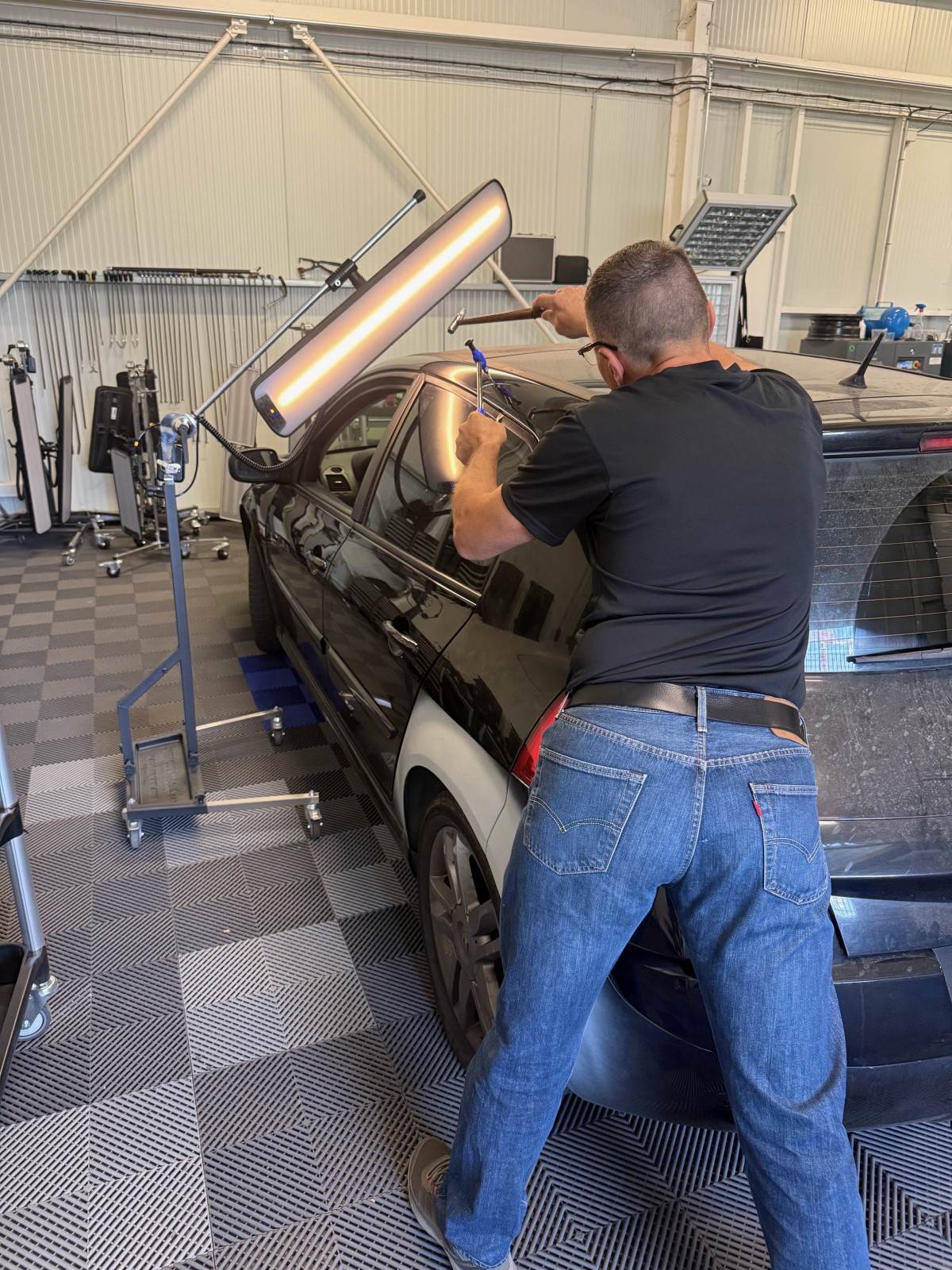 En pleine immersion dans sa formation intensive de 4 semaines au débosselage sans peinture, notre stagiaire Mickael a franchi une étape clé cette semaine : la technique du redressage sur brancard.